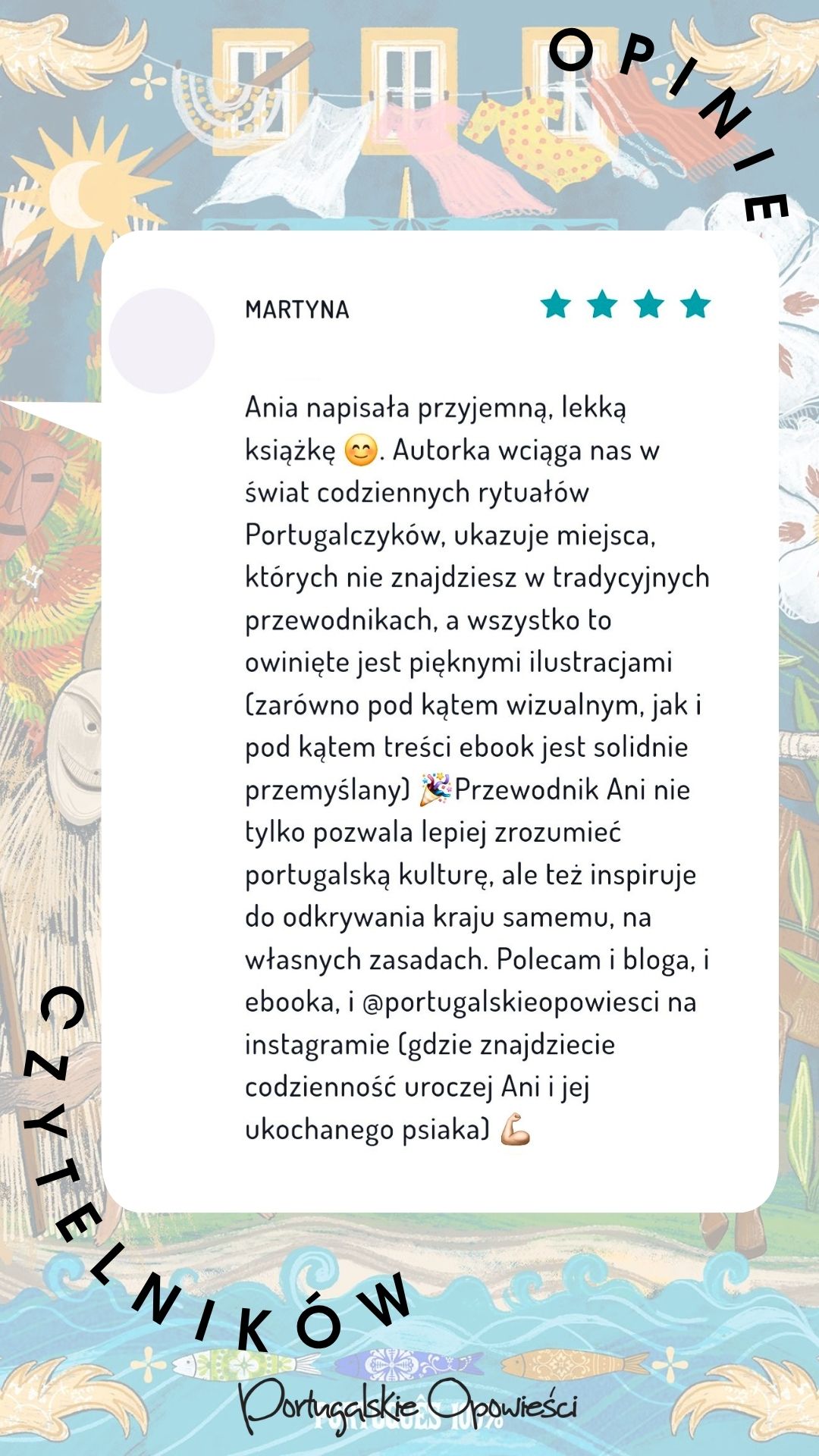 Ania napisała przyjemną, lekką książkę 😊. Autorka wciąga nas w świat codziennych rytuałów Portugalczyków, ukazuje miejsca, których nie znajdziesz w tradycyjnych przewodnikach, a wszystko to owinięte jest pięknymi ilustracjami (zarówno pod kątem wizualnym, jak i pod kątem treści ebook jest solidnie przemyślany) 🎉Przewodnik Ani nie tylko pozwala lepiej zrozumieć portugalską kulturę, ale też inspiruje do odkrywania kraju samemu, na własnych zasadach. Polecam i bloga, i ebooka, i @portugalskieopowiesci na instagramie (gdzie znajdziecie codzienność uroczej Ani i jej ukochanego psiaka) 💪🏼